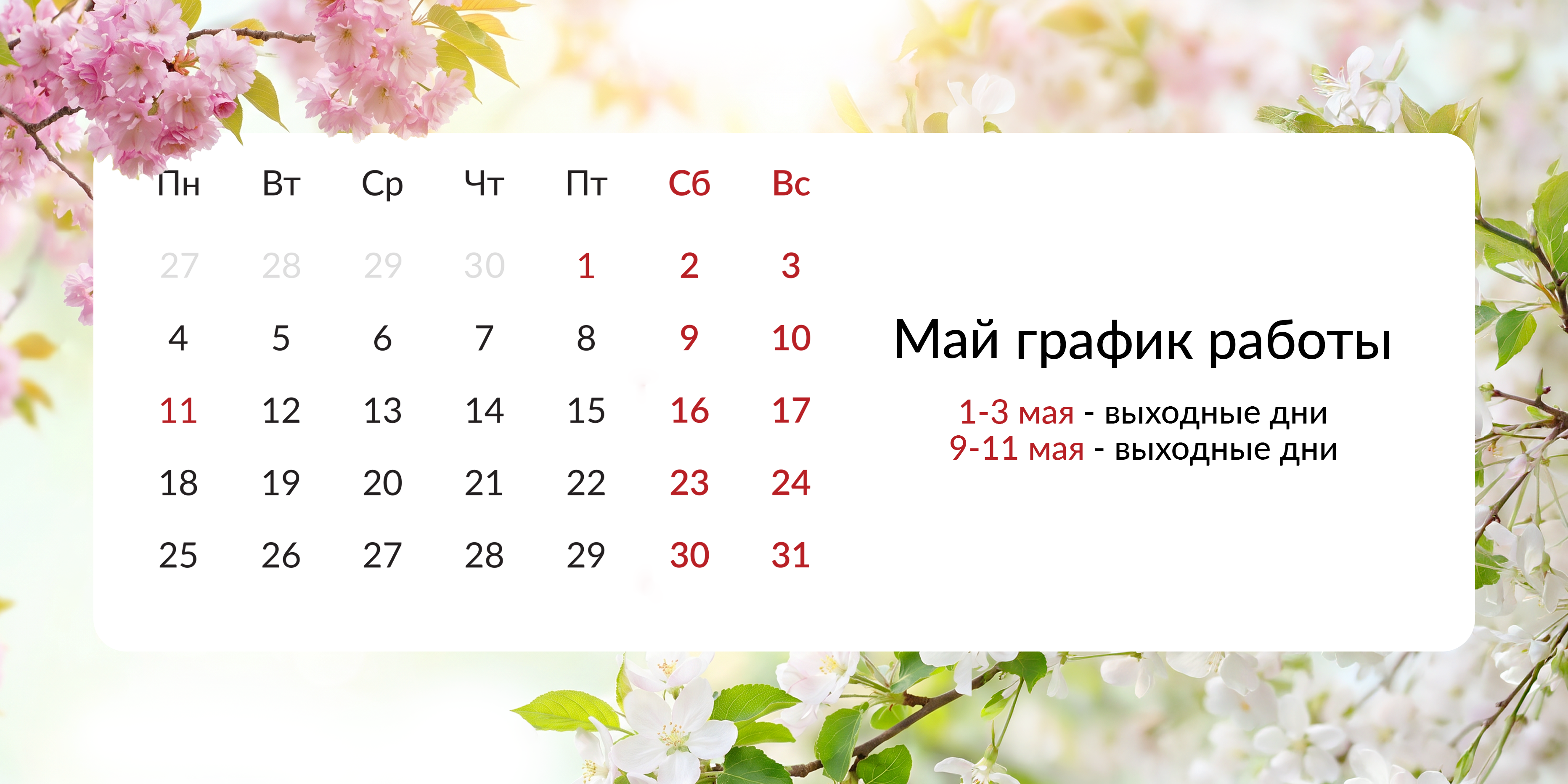 Не работаем: ❌ 1–3 мая ❌ 9–11 мая ❌ 16–17 мая